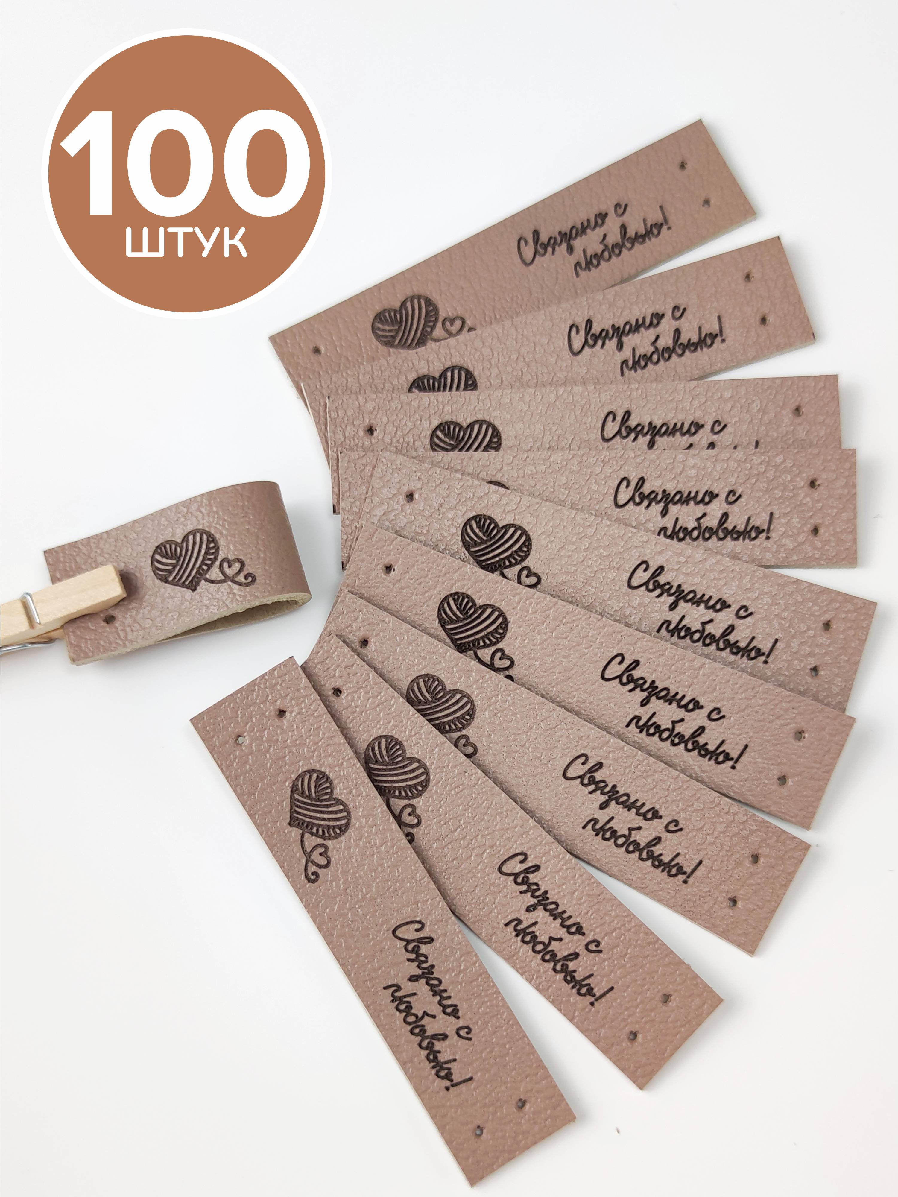 В наборе 100 пришивных бирок с надписью "Связано с любовью" и сердцем с другой стороны. Каждая бирка изготовлена из натуральной кожи толщиной 1,2–1,4 мм, а оборотная сторона аккуратно заполирована для идеального внешнего вида. Размер бирок— 67×15 мм, с удобными отверстиями для пришивания.