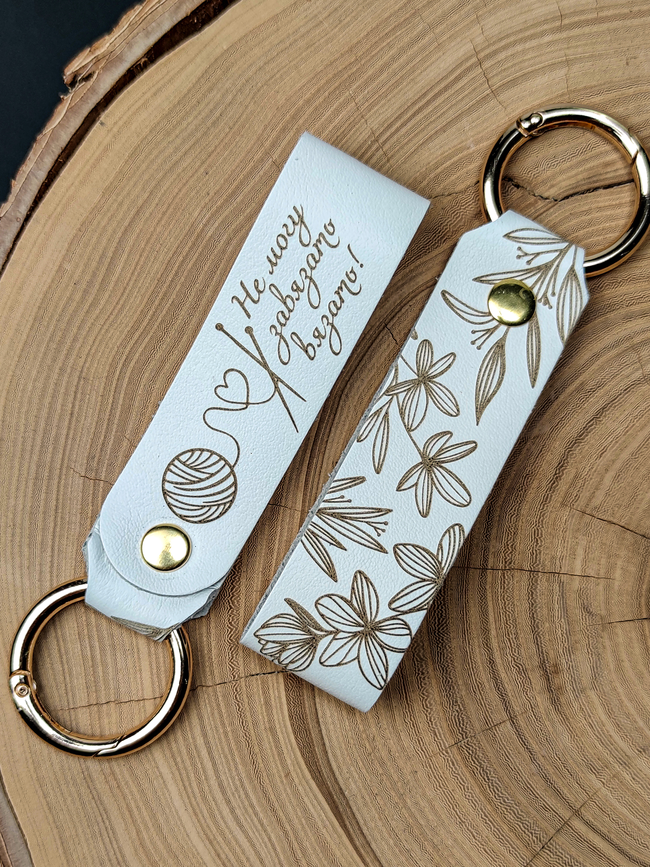 Брелок выполнен из качественной натуральной кожи и украшен изящной двусторонней гравировкой. На одной стороне расположился утонченный цветочный орнамент, а на другой — забавная надпись «Не могу завязать вязать», которая добавит вашему образу неповторимую индивидуальность.