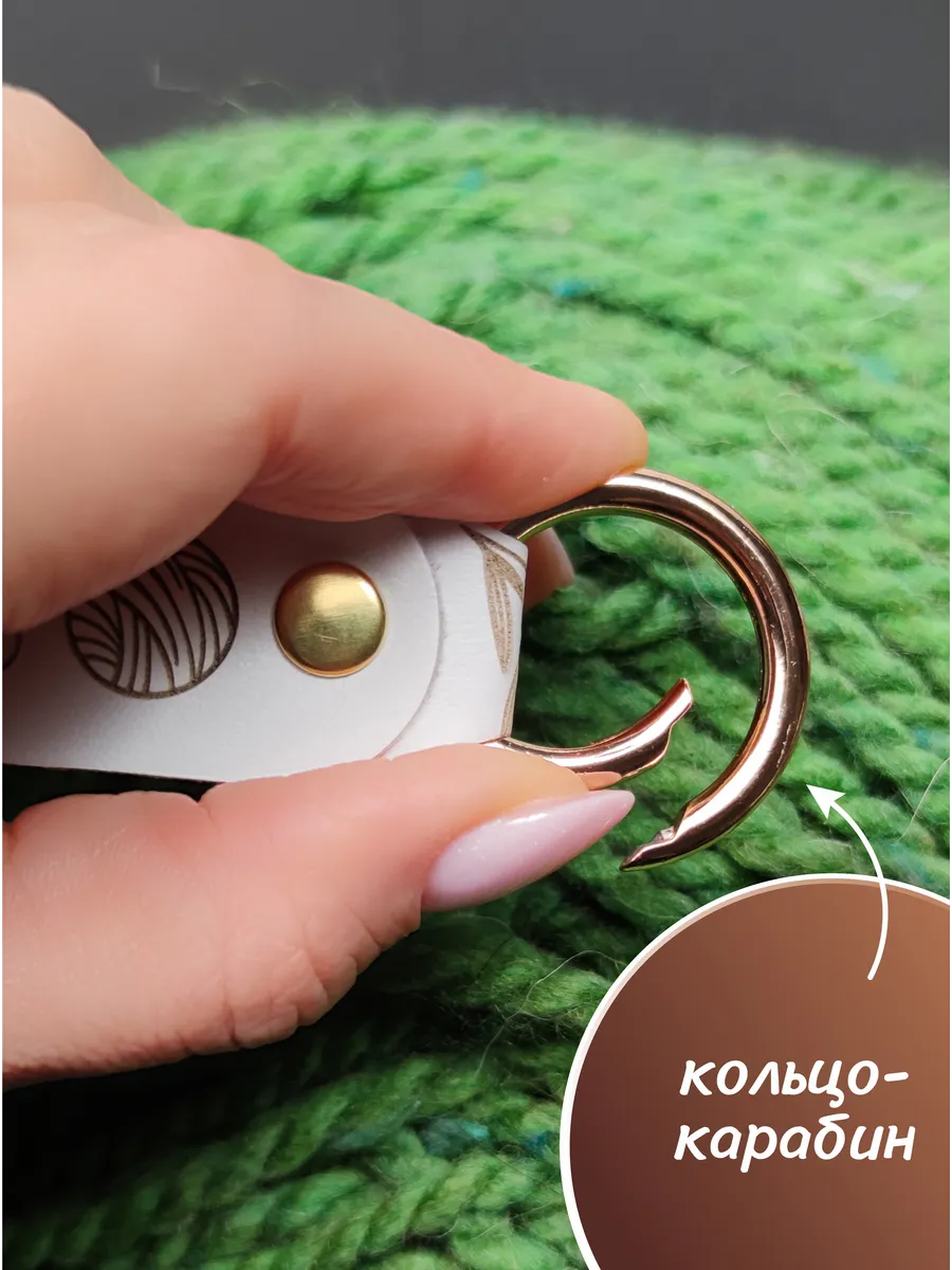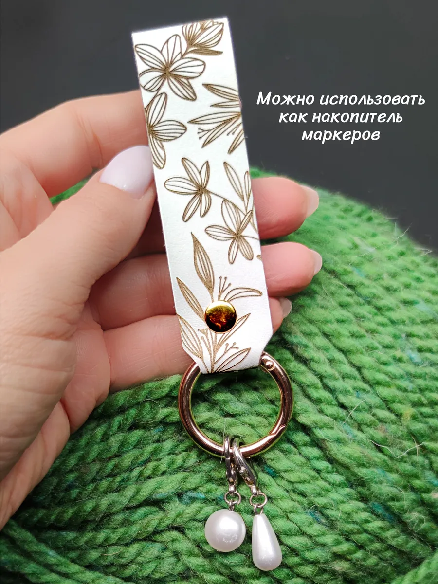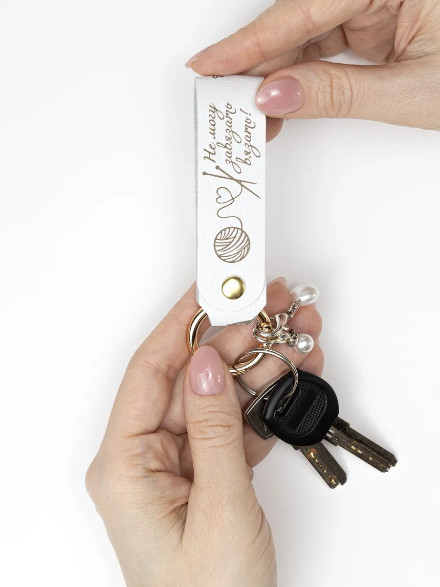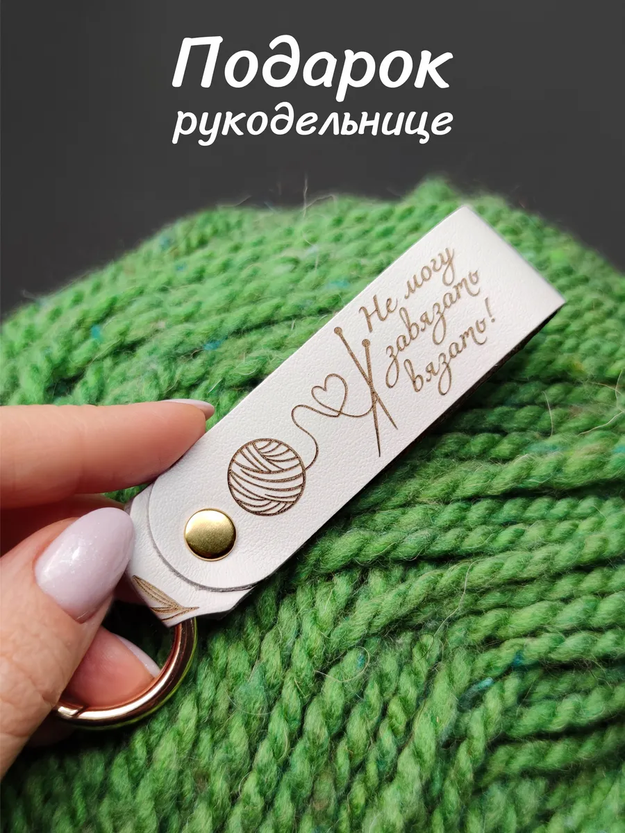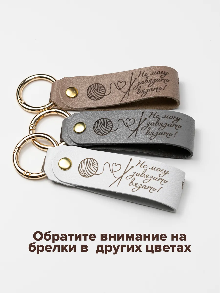 Брелок выполнен из качественной натуральной кожи и украшен изящной двусторонней гравировкой. На одной стороне расположился утонченный цветочный орнамент, а на другой — забавная надпись «Не могу завязать вязать», которая добавит вашему образу неповторимую индивидуальность.